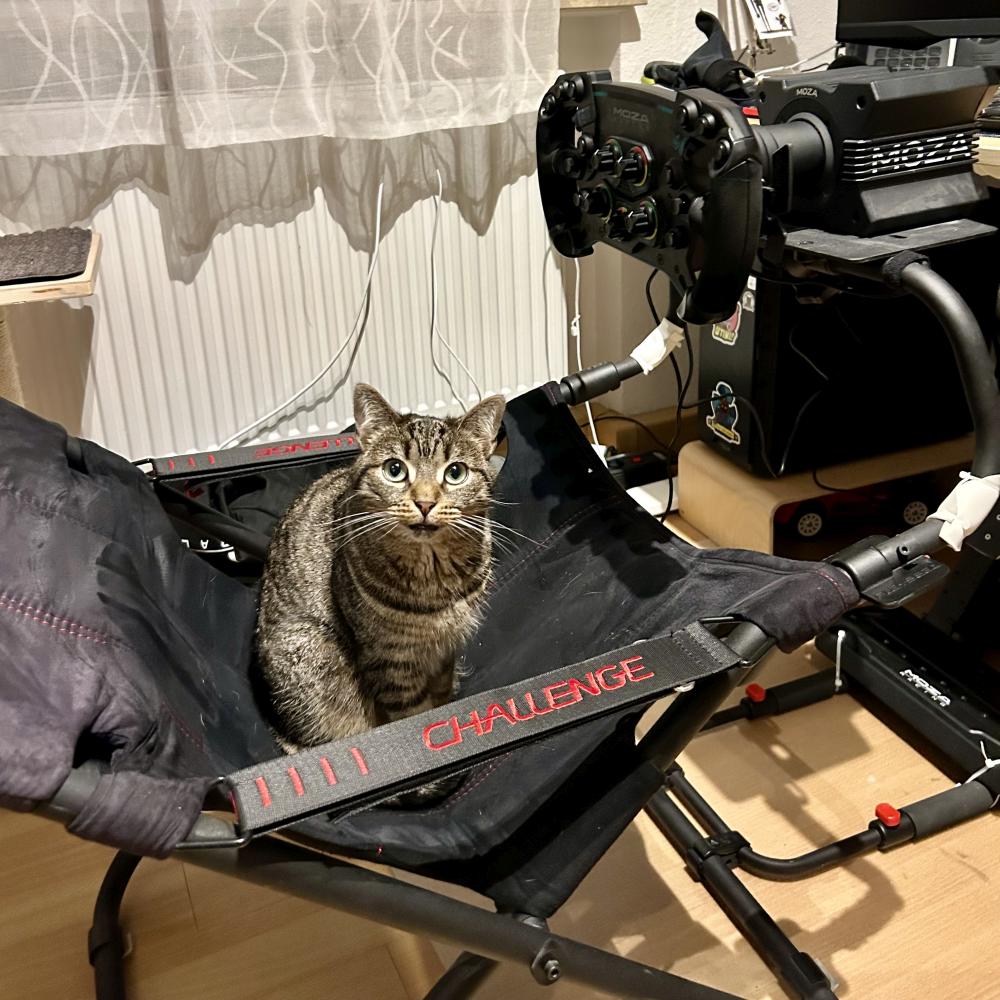 Und Fine ist ein großer Fan von Simracing. Vor allem mag sie Regenrennen. Sie sagt, sie mag die Herausforderung. Ich behaupte es wäre wegen des Scheibenwischers… Sie jammert immer dass sie Hilfe braucht, weil sie nicht an die Pedale kommt und weil sie ja keine Daumen hätte um die Knöpfe zu drücken.